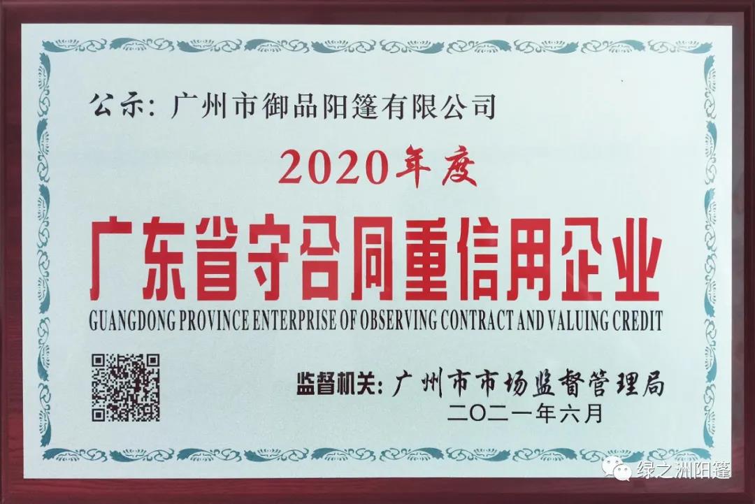 經(jīng)廣州市市場監(jiān)督管理局審核批準(zhǔn),廣州御品陽蓬有限公司獲得“2020年度廣東省守合同重信用企業(yè)”稱號,并獲得了榮譽(yù)證書。這是本公司繼“國家高新技術(shù)企業(yè)”“廣東省科技型中小企業(yè)”“最受消費(fèi)者歡迎獎(jiǎng)”等多個(gè)榮譽(yù)后再增添的一份殊榮,公司憑借長期積累沉淀的強(qiáng)勁實(shí)力和始終如一的卓越服務(wù),再次得到行業(yè)與社會(huì)的認(rèn)可,專注、專業(yè)的形象深入人心。