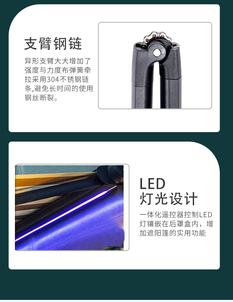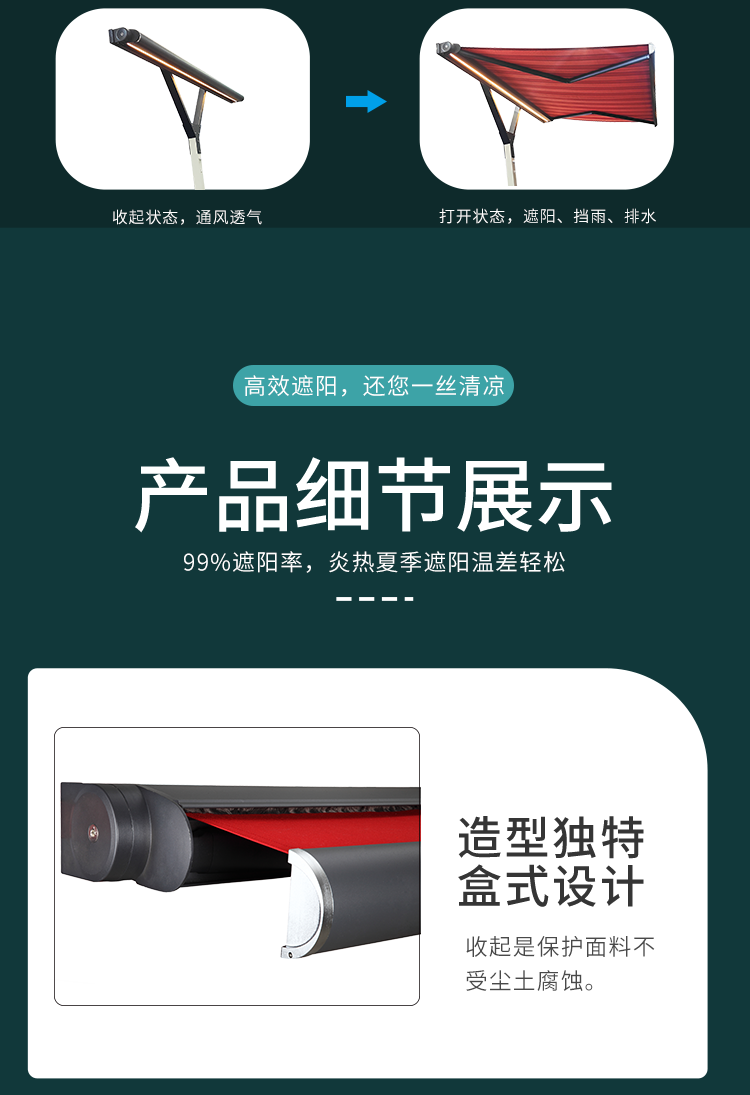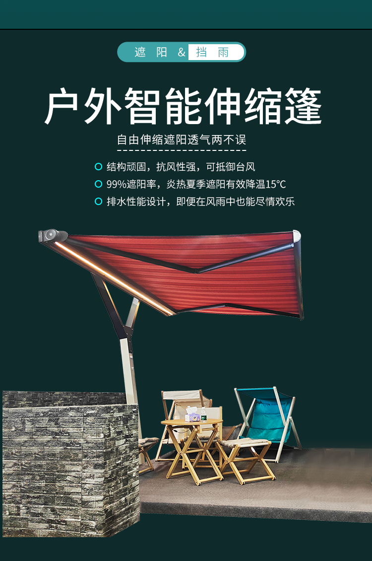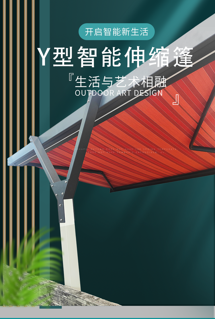 Y型伸縮遮陽篷,是一款融合了精湛工藝與創(chuàng)新設(shè)計的戶外遮陽產(chǎn)品。 其支架采用堅固耐用的鋼結(jié)構(gòu),為整個遮陽篷提供了穩(wěn)定可靠的支撐;操作方式靈活多樣,既可以選擇手動控制,享受親力親為的樂趣,也可以體驗電動控制帶來的便捷,輕松實現(xiàn)曲臂篷的展開與收起。 所選用的專用戶外遮陽面料,不僅能有效阻擋紫外線的侵襲,保護您的肌膚免受傷害,還具備出色的防雨性能,讓您在多變的天氣中依然能擁有安心的戶外時光。 無論是庭院中的溫馨聚會,還是餐廳戶外的愜意用餐,它都能恰到好處地提供庇護。其占用空間小的特點,使得它能夠在各種場所輕松安置, 為您的戶外空間打造一片獨特的舒適天地。