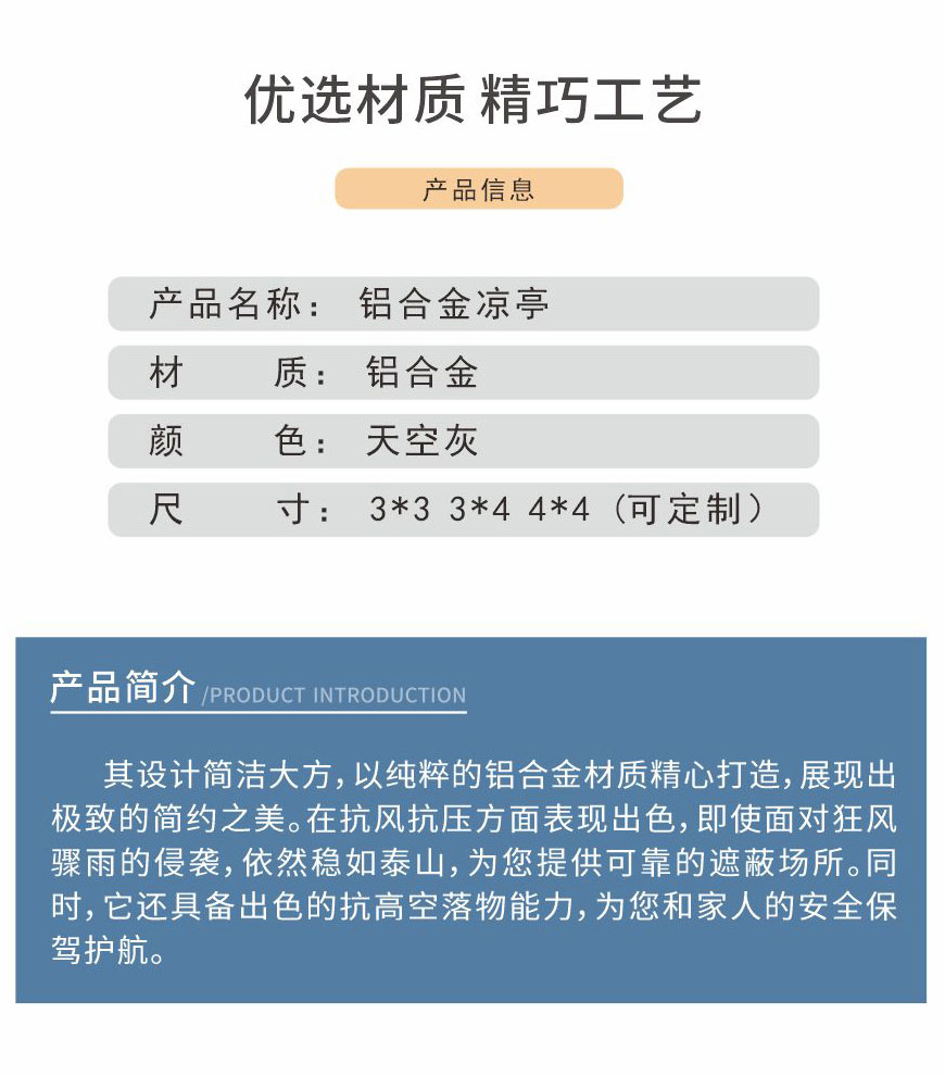 其設(shè)計簡潔大方,以純粹的鋁合金材質(zhì)精心打造,展現(xiàn)出極致的簡約之美。鋁合金材質(zhì)賦予了它卓越的性能。在抗風(fēng)抗壓方面表現(xiàn)出色,即使面對狂風(fēng)驟雨的侵襲,依然穩(wěn)如泰山,為您提供可靠的遮蔽場所。同時,它還具備出色的抗高空落物能力,為您和家人的安全保駕護(hù)航。